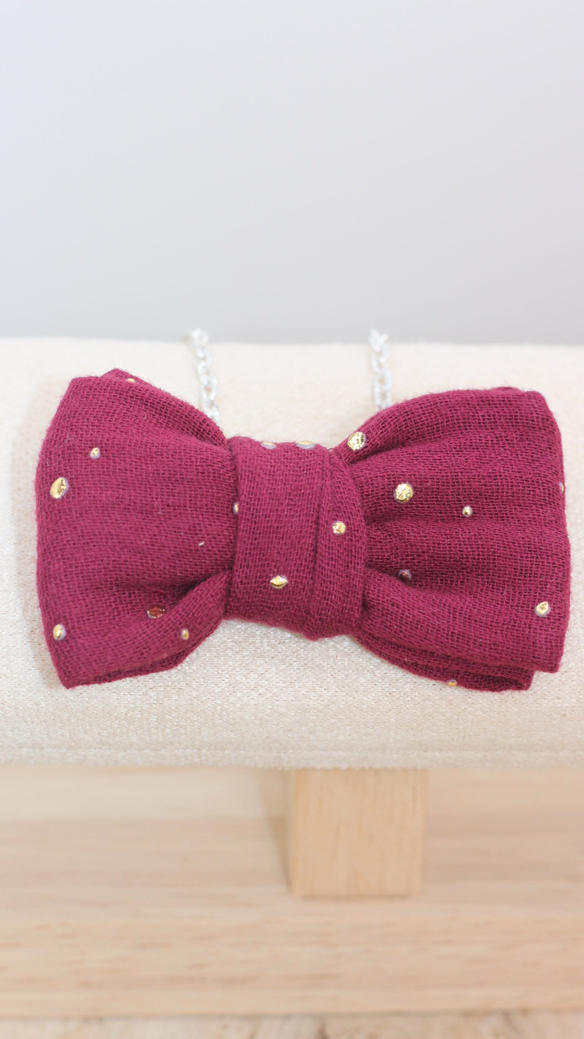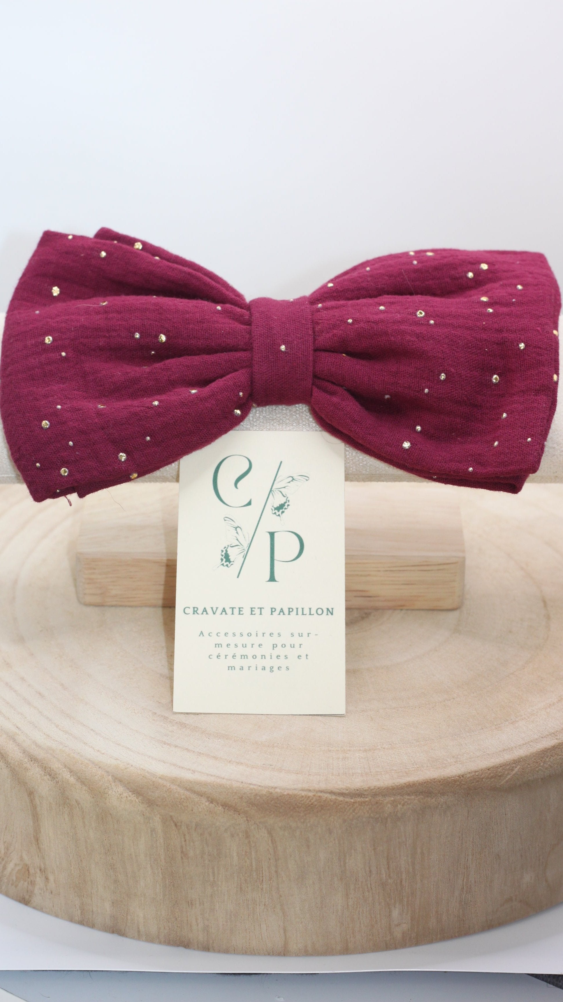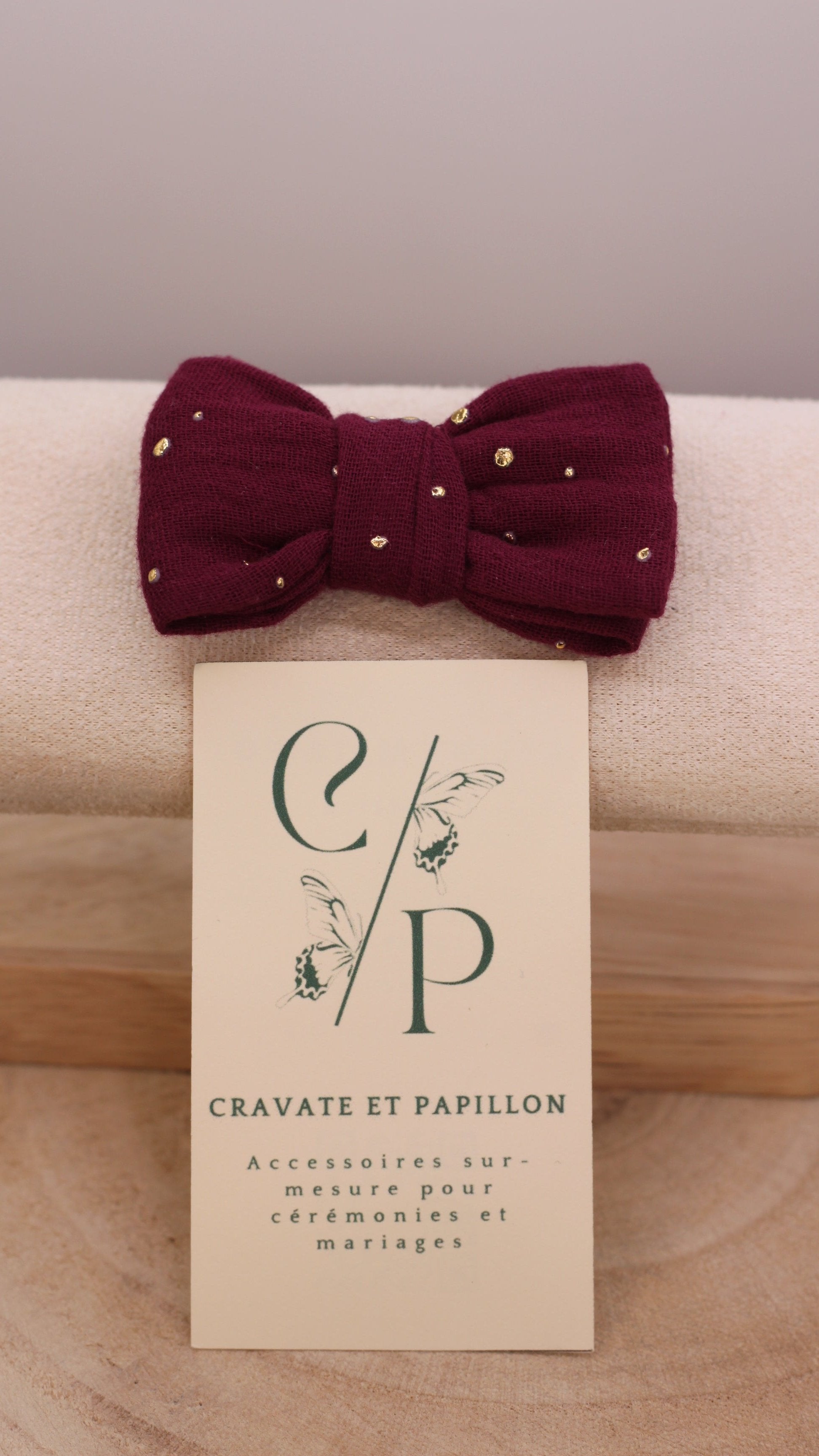 Élevez votre style avec nos nœuds "Bordeaux Élégant", des accessoires polyvalents qui incarnent le raffinement. Fabriqués à partir d'un riche coloris bordeaux et agrémenté de pois dorés, nos nœuds se transforment aisément en barrette, nœud papillon, sautoir, bracelet ou boucles d'oreille.