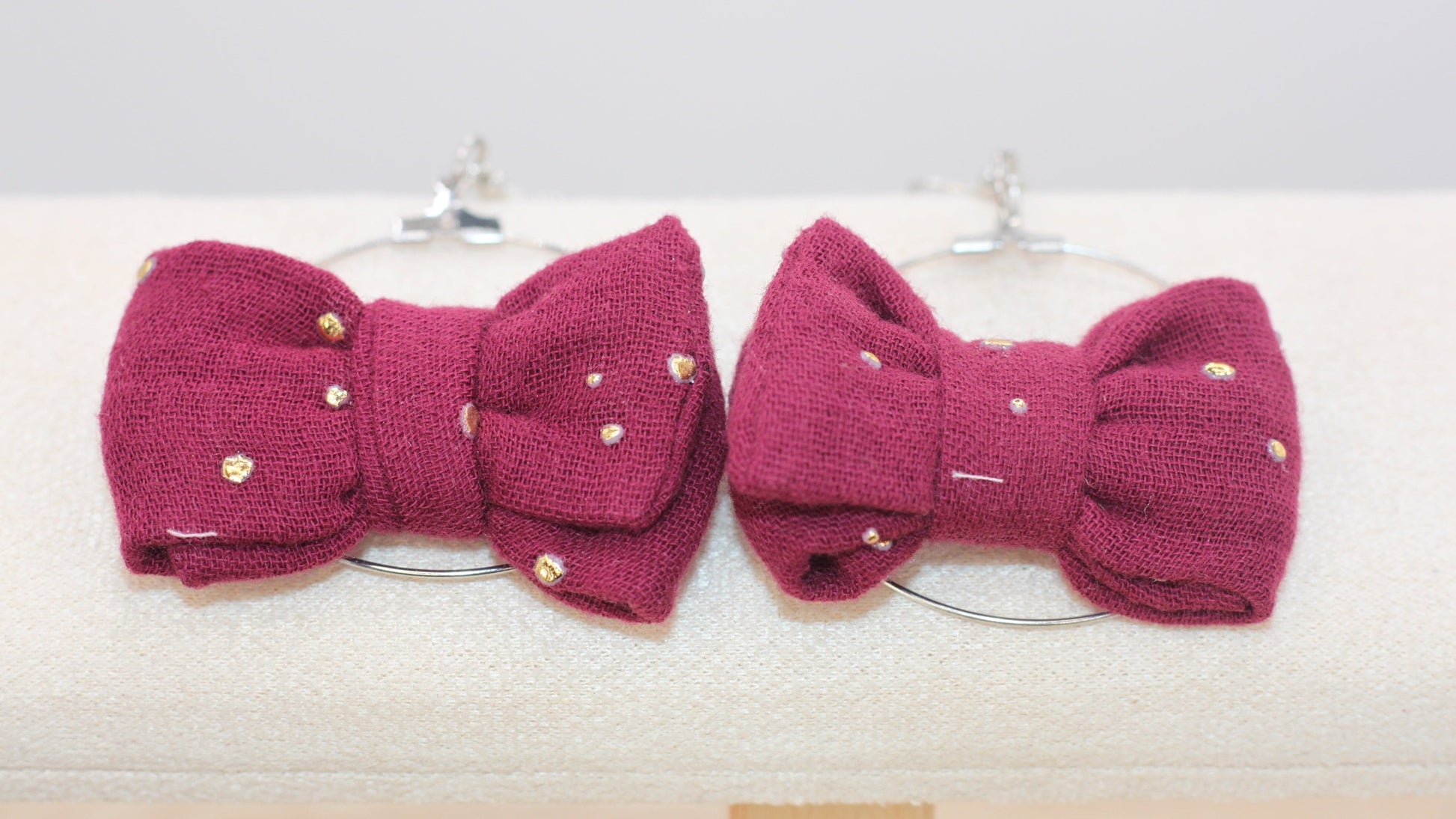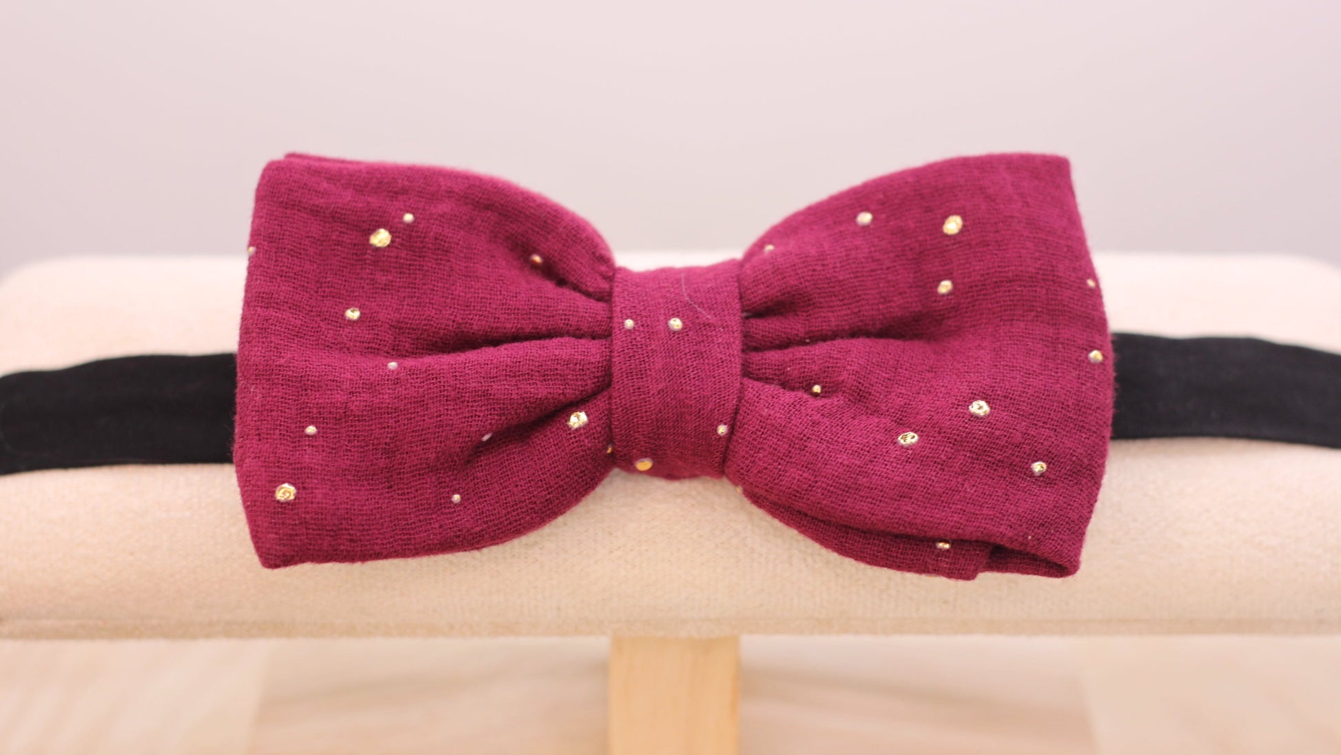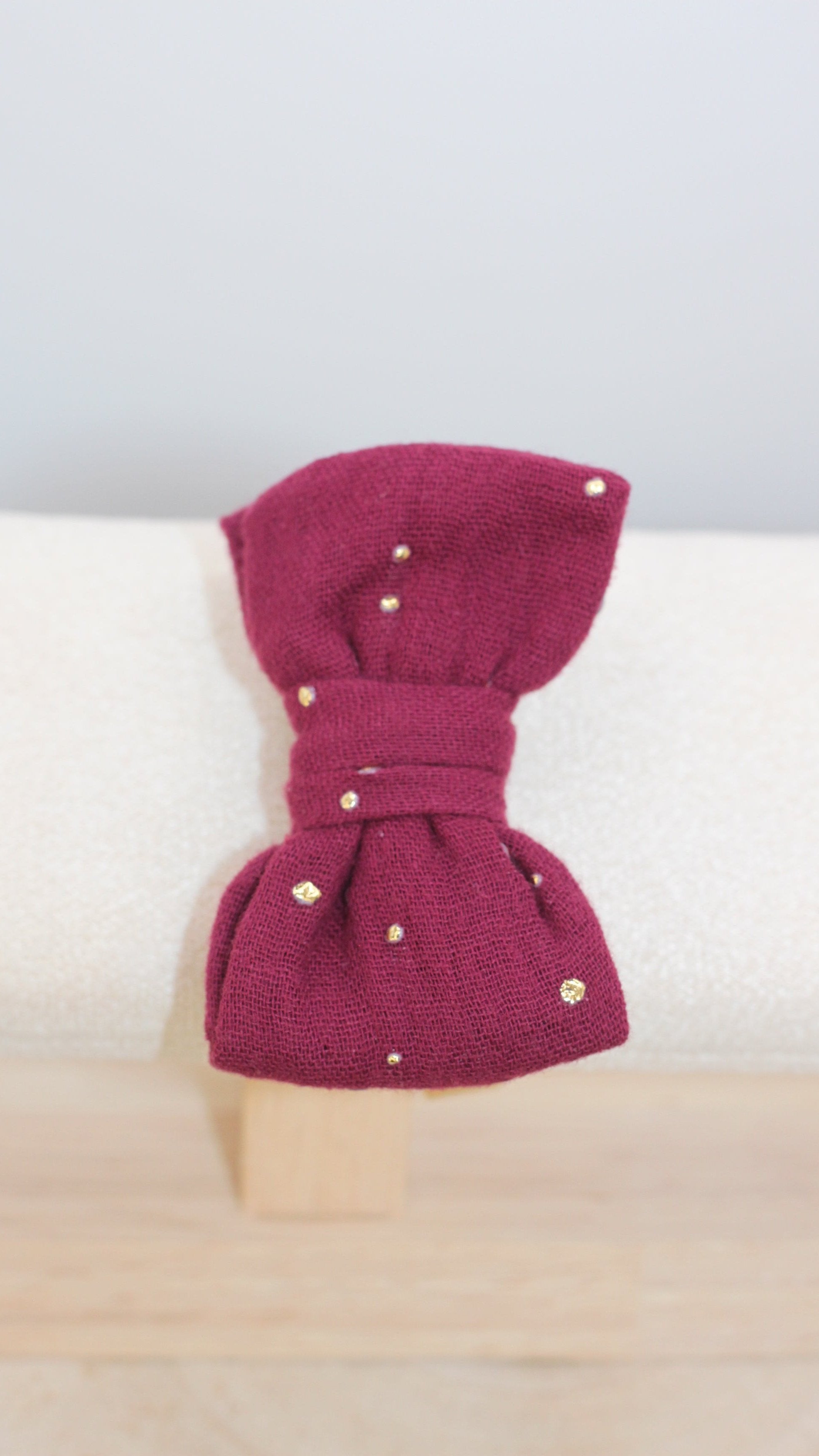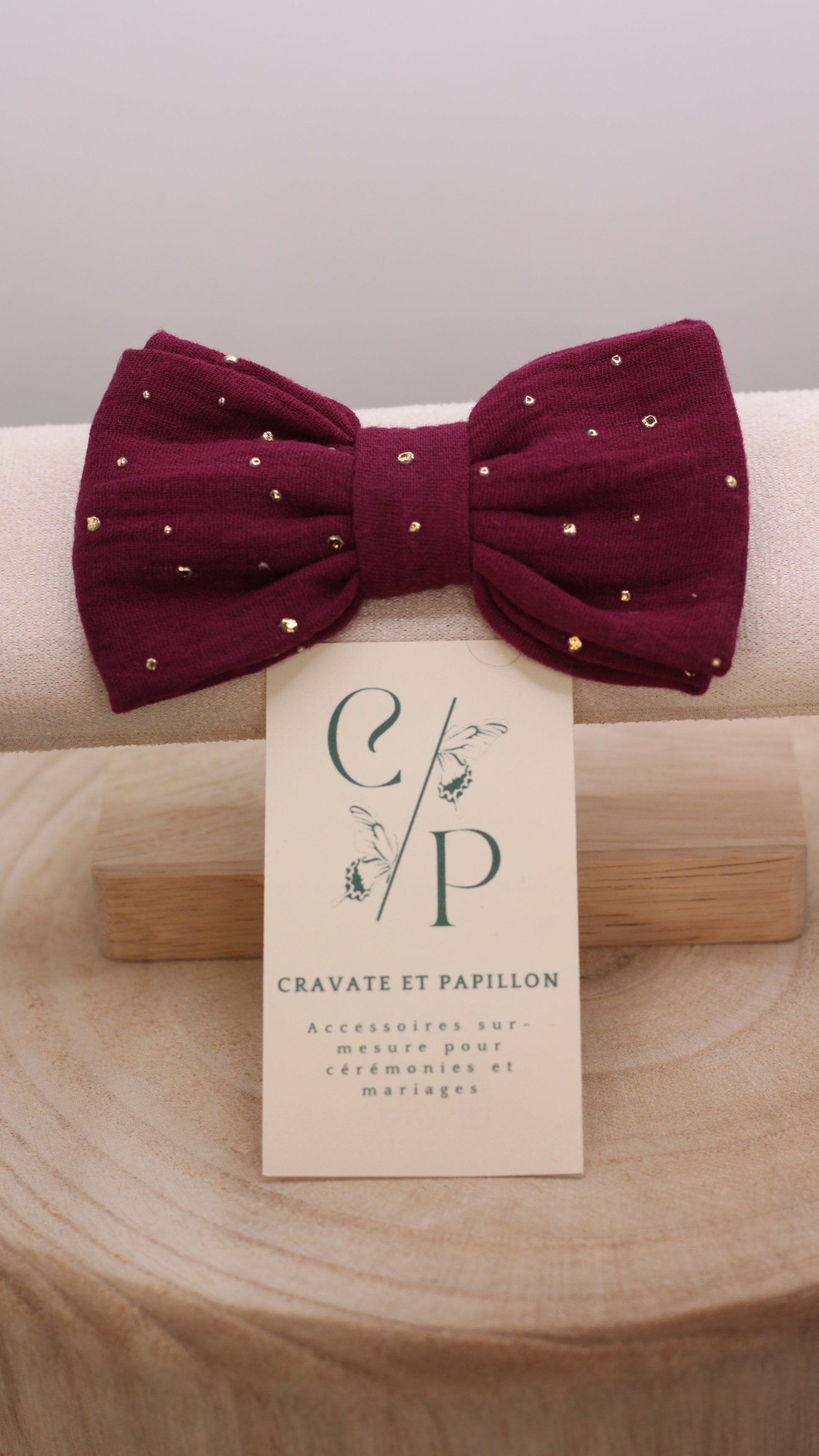 Élevez votre style avec nos nœuds "Bordeaux Élégant", des accessoires polyvalents qui incarnent le raffinement. Fabriqués à partir d'un riche coloris bordeaux et agrémenté de pois dorés, nos nœuds se transforment aisément en barrette, nœud papillon, sautoir, bracelet ou boucles d'oreille.