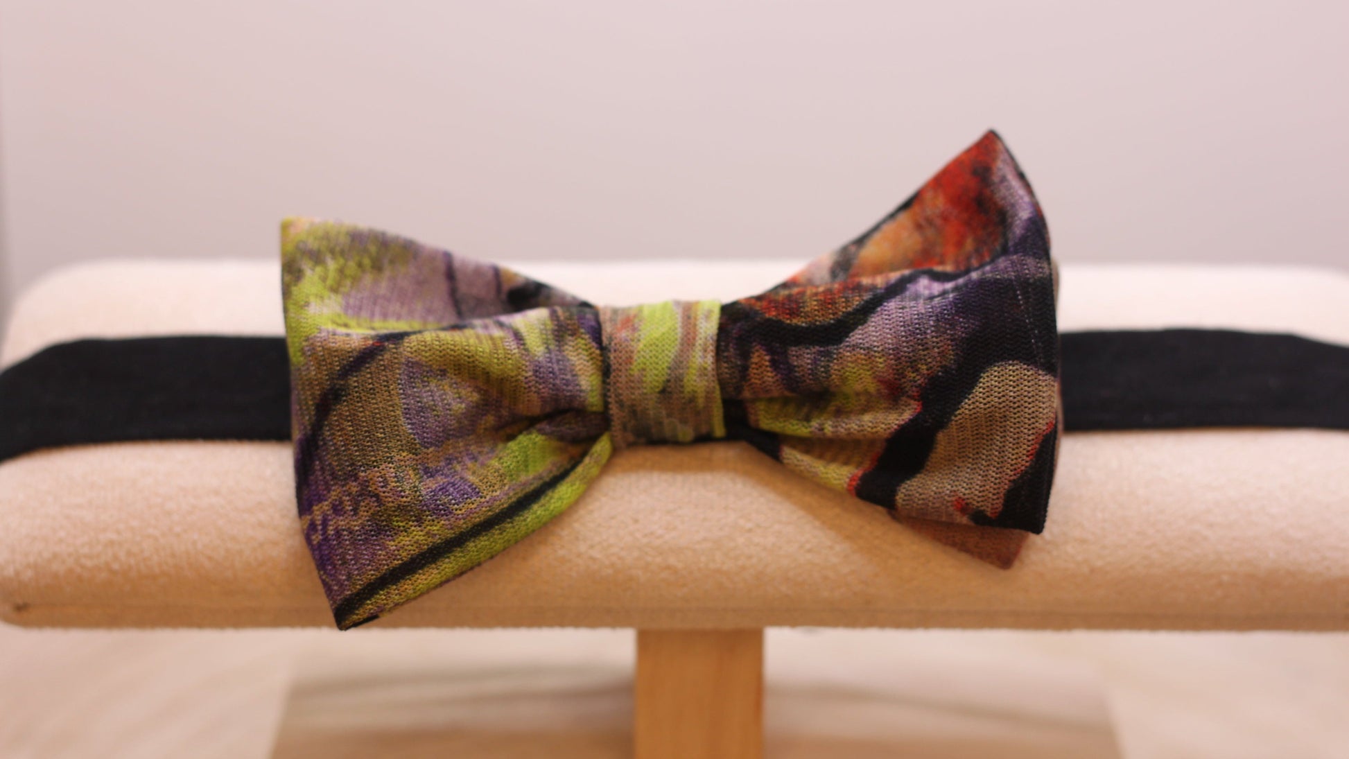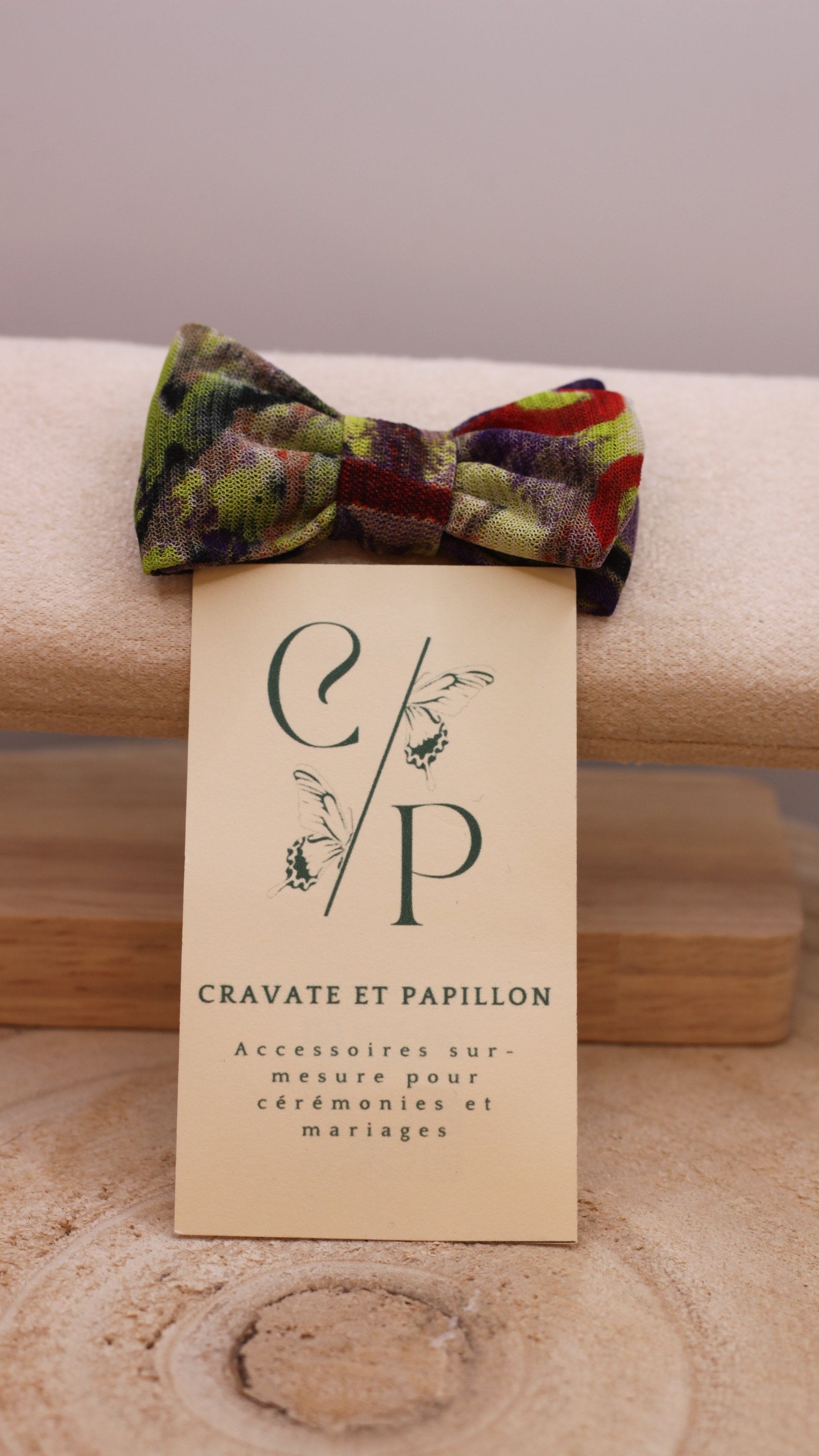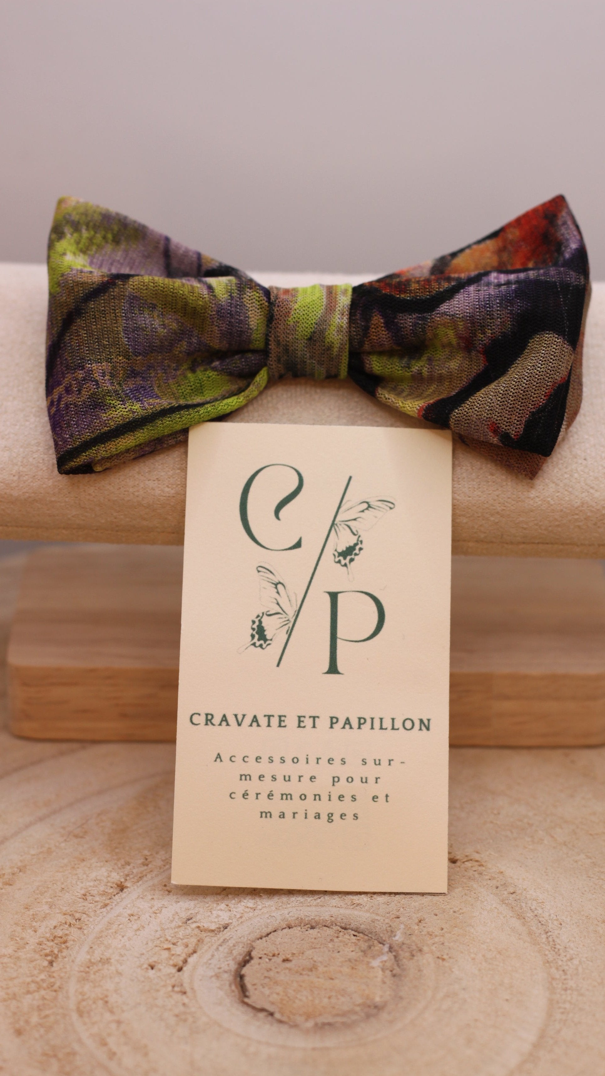 Nœud Papillon : nœud d'environ 10*6 cm monté sur un tour du cou de couleur unie qui varie selon la couleur initiale du nœud. Le tour du cou mesure environ 50 cm et est réglable.