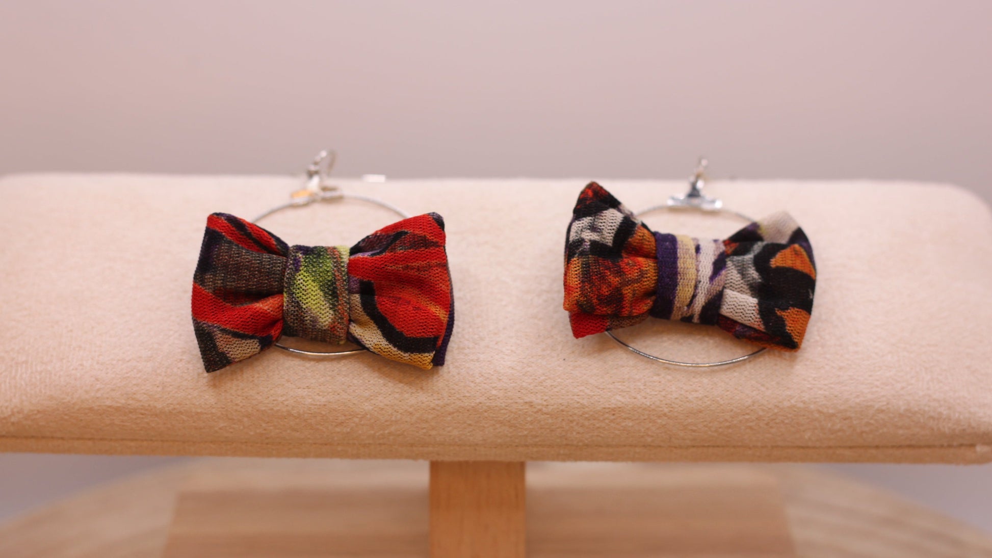 Boucles d'oreille nœuds : nœuds d'environ 5*3 cm montés sur des créoles d'environ 40mm de diamètre (base argentée)